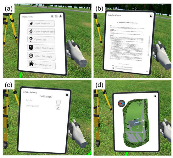 In the main menu of the virtual tablet (Figure 2a), the user can access basic software functions that are useful for the virtual labs: marking the position, which drops a temporary point; open the pedometer for counting paces; and open the lab instructions, which opens a PDF with lab instructions for students (Figure 2b). Students can open the fieldbook to access their notes and make modifications. The “open settings” option allows students to mute ambient sounds of the virtual environment. From settings, the students can select the lefty mode, switching the selection pointer to their left hand (Figure 2c). At the top right corner of the main menu, there are three additional options, i.e., save progress, export a lab report in PDF, and an option to open a map of the area (Figure 2d).