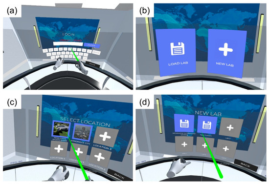 The virtual reality ready room: (a) log in; (b) load or create a new lab; (c) location selection; (d) lab selection.