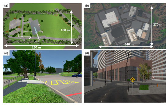 Virtual environments: (a) Penn State Wilkes-Barre; (b) Windridge City by Unity; (c) immersed view of the Penn Stat Wilkes-Barre environment; (d) immersed view of the Windridge City environment.