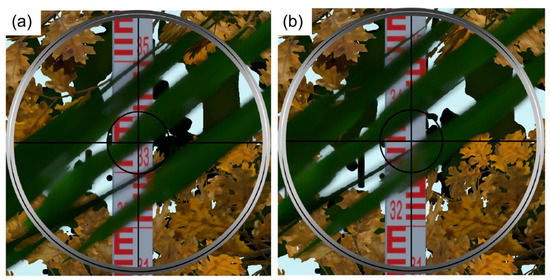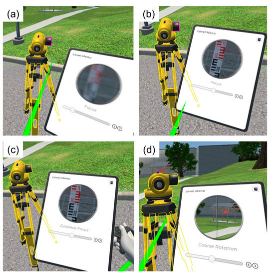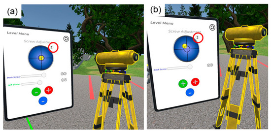 Figure 13 shows the tripod roughly leveled (within ±3°) and the object normal roughly aligned with the y-axis after manipulation of the tripod legs in VR. Next, the user moves to precise leveling using the tribrach screws. To make manipulation of tribrach screws more realistic, we color coded the tribrach screws, and restricted the user to select up to two screws at a time (Figure 14a). The plus signs add a corresponding tribrach screw to the level menu and the minus signs remove them. For example, in Figure 14a, the green and blue screws have been added. This resembles the main leveling technique used by surveyors of moving the two tribrach screws first and then the third one separately. In this example, the third screw is the red one. In earlier versions of the software [38], the circular level vial in Figure 14a depicted a range of −1° to +1°, and the fine arrow buttons changed the rotation by 0.01° (36′′). For leveling operations, this is not sufficient to achieve high leveling accuracy, as automatic levels are equipped with compensators that often allow leveling to within ±0.3′′ and can achieve accuracies of about 1 mm in 1 km [32]. This was changed to a two-step approach for the tribrach screws. The ranges in the circular level vials in Figure 14a were made the same as the tripod legs, thus the vial now depicts a range of −3° to +3°, and the fine arrow buttons change the rotation by 1′. Then, by selecting a toggle button, the user moves to a second, zoomed/precise, circular vial screen that allows precise leveling (Figure 14b). In this second screen, the vial depicts a range of −3′ to +3′ and the fine arrow buttons change the rotation by 1′′. This means that the instrument can now be leveled to within 1′′ by the users, which corresponds to an error of 0.5 mm at 100 m. Students are not expected to conduct level loops that are longer than 100–200 m, as that would necessitate very large virtual environments and spending more than 20–30 min in VR. This can increase nausea symptoms [55,56,57] and, therefore, this level of precision is sufficient for most surveying virtual labs. It is also worth noting that we can add a small “fixed” tilt to the telescope and replicate the collimation error [38]. This is a great addition for demonstration purposes and creating special labs with a focus on balancing the backsight and foresight distances or with a focus on calibration of level instruments and estimation of the collimation correction.