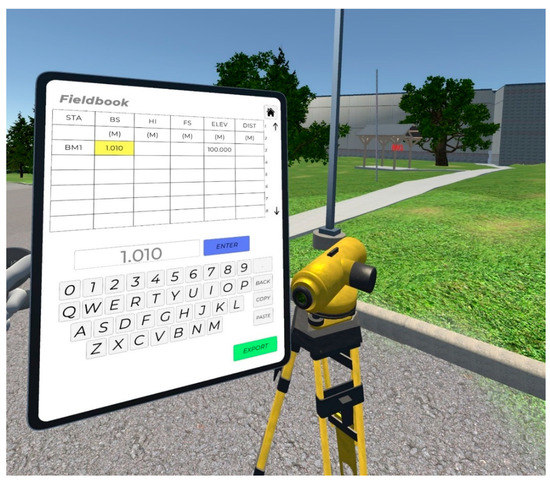 Most components in the tripod and level are selectable, giving them separate functionality, namely, these are tripod legs, tribrach screws, telescope, peep sight, focus knob, and eyepiece. As with the rod, these individual components are controlled via the virtual tablet. The instrument focus is simulated through blurring of the picture with a distance-dependent component and a focus capability from 0 to 150 m. Figure 6a,b show the instrument view before and after focusing. Note that, in Figure 6b, the crosshair is still blurry. The user needs to select the eyepiece and focus the crosshair (Figure 6c). Then, by selecting the peep sight, the user has a coarse rotation of the instrument (Figure 6d), which allows the user to approximately aim towards the rod. The field of view of this coarse rotation is 20°. The student can then select the main body of the instrument, which brings the fine rotation view and allows for precise aiming (Figure 7a). The field of view in the fine view is 1°30′, similar to the Topcon instrument used as the model. The user can go towards the instrument and lean towards the telescope to make a measurement (Figure 7b). However, reading the rod by leaning towards the instrument can be difficult in VR because of clipping (when the camera intersects the object); therefore, users can make observations using the projected telescope view on the virtual tablet. For recording measurements, students have a virtual fieldbook. The virtual fieldbook is set up like a typical spreadsheet with numerous cells that are selectable (Figure 8). When they are finished with a lab, they are able to press an export button (see bottom right corner in Figure 8) and have the entire fieldbook exported in CSV format for use elsewhere.