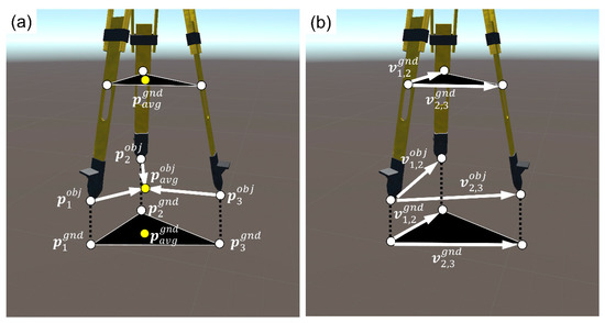 By aligning to , we can position the object (tripod) to the ground. The next step is to align the normals that are formed by the support points and their intersection to the ground. We first get a normal of the object’s average point perpendicular to the hyperplane of the supporting points. Similarly, we can get a normal of the ground’s average point perpendicular to the hyperplane at the intersection of the supporting points with the ground. A hyperplane is formed by simply taking two vectors between the endpoints, as shown in Figure 10b. The vectors of the object hyperplane can be found using the following formulas: