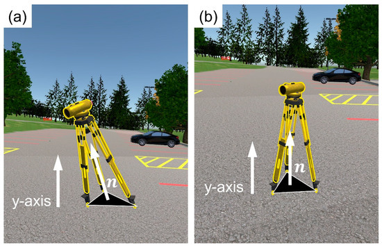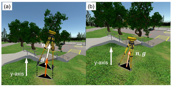 Example of the tripod positioning: (a) tripod is held in the air, the object and ground normal are shown; (b) the object normal is aligned with the ground normal when the user drops the tripod. The y-axis, which defines the vertical (up-down) direction in Unity, is also shown for reference. The instrument should be aligned with the vertical direction to be considered leveled.