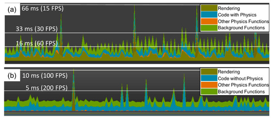 In surveying, the legs on the tripod are adjusted to level the instrument based on the encountered ground shape. The positioning must be recalculated in every frame to give a smooth transition. For a pleasant and optimal VR experience, the rate of switch, called frames per second (FPS), should be maintained at least at 60 FPS [53], while Oculus recommends 90 FPS [54]. Figure 12 shows a performance comparison when a full physics simulation of the tripod legs is used (Figure 12a) versus our technique (Figure 12b). The dark green color shows the execution time allocation due to rendering, the blue is our code implemented with physics, the orange is other related physics functions in Unity, and the light green is background functions of Unity. When the full simulation is used, frames routinely spike to 66 ms, which corresponds to 15 FPS and results in unpleasant lag. The process using our technique takes far less than 10 ms, maintaining 60 FPS. Therefore, our approach does not create any additional burden. We found this performance improvement to be vital to the simulation, as smooth adjustments of different pieces of equipment would not be possible without it. The computer system used for this simulation had an Intel i7-8700 CPU (3.2 GHz), 64 GB of RAM, and a NVIDIA GeFORCE GTX 1060 6GB GPU.
