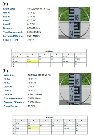 Figure 15a shows a real case example, where the user recorded a measurement, but did not accurately level the instrument. The recorded measurement is 0.496 m. The user realized it and went back to relevel both the rods and instrument (Figure 15b). The recorded measurement is now 0.482 m. In addition, we see that the true measurement (the measurement that the user should have observed for the given leveling state of the instrument and rod) is within 1 mm of the observed measurement. This kind of feedback is unattainable during physical labs and can help students reflect on their mistakes and improve their surveying skills as well as comprehend theoretical concepts in greater depth.