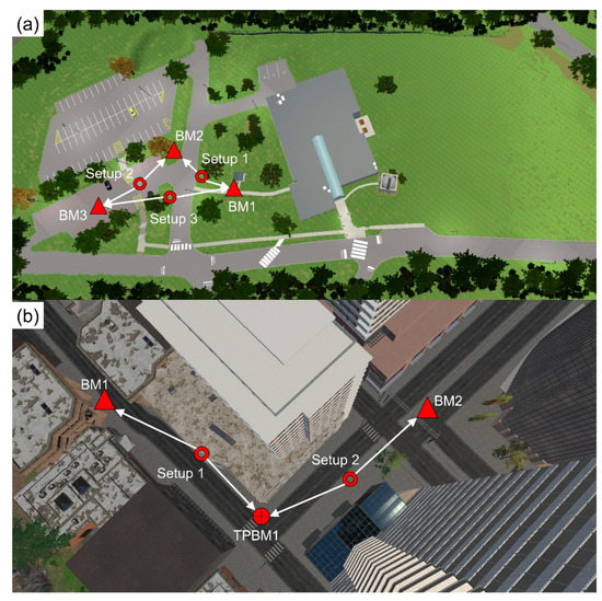 Virtual reality lab examples: (a) three benchmark loop; (b) level line in city environment. BM, benchmark; TPBM, temporary BM.