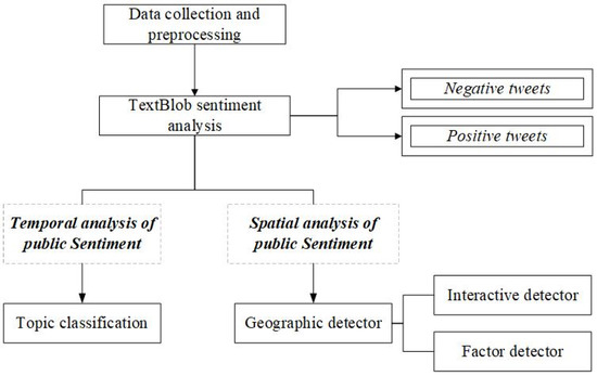 The research process of the temporal and spatial analysis of public sentiment and its influencing factors is provided in Figure 2. First, we collect tweets related to disasters and preprocess them. Then, we calculate the sentiment value of the tweets and divide the sentiment polarity of the tweets based on the TextbBlob. Finally, a temporal and spatial analysis of public sentiment was conducted. Topic classification is used to explore the evolution of public topics and analyze the reasons for the temporal changes in public sentiment based on the evolution of topics. Moreover, we use a geographic detector to explore the factors that affect the spatial distribution of public sentiment.