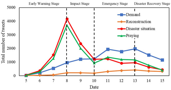 TextBlob is used to calculate specific sentiment values, and the quantified data can better reflect the trend of sentiment changes. Through topic classification and drawing the daily variation curve, we found that the topics discussed by the public after the disaster are mainly divided into the four categories of “demand”, “disaster situation”, “praying”, and “reconstruction”. The changing characteristics of these topics reflect the different stages of the disaster, which is basically in line with the five main stages of the disaster cycle as defined by Debarati and Michel [47], namely the early warning stage, impact stage, emergency stage, recovery stage, and reconstruction stage. The evolution of public topics corresponds to changes in sentiment and can be explained by one another.
