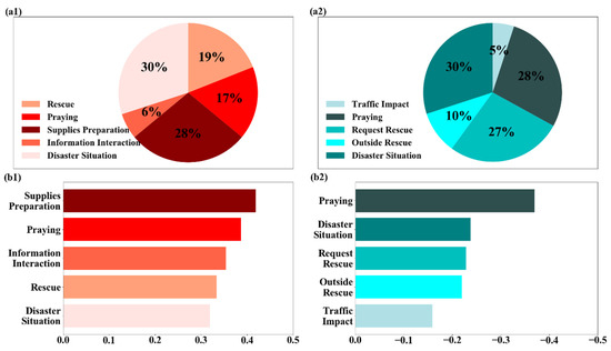 Similarly, we classified the positive and negative tweets separately to explore the differences in the content that people pay attention to in different sentiment states. Among the positive and negative emotions, people are most concerned about the “disaster situation”. After a disaster occurs, people have a wide range of discussions about the disaster situation. These discussions can be used for disaster monitoring and disaster assessment [19,39].