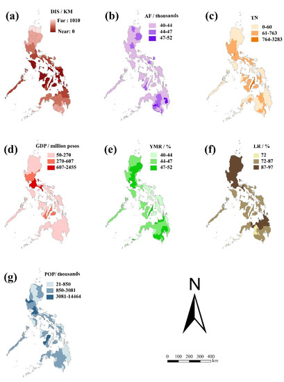 The spatial pattern of 7 specific indicators. (a)DIS (b) AF (c) TN (d) GDP (e) YMR (f) LR (g) POP.