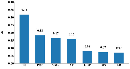 The factor detection results show the interpretive ability of the candidate factors for the overall sentiment value. As show in Figure 8, TN (Number of tweets, q = 0.32) has the highest q value and the strongest determinant power, which indicates that TN is the dominant factor. The number of tweets represents people’s desire to express. When there are more tweets, the desire to express is stronger, and the emotions are richer. POP (Population, q = 0.18) and YMR (Young and middle-aged population ratio, q = 0.17) follow TN. The demographic structure of society has two influences on sentiment. First, the young and middle-aged population is the main user of social media, and most of the tweets on Twitter are posted by them. Second, the young and middle-aged population are the backbone of disaster emergency management, and they are the most active in responding to government calls and responding to disasters. AF (Number of people affected, q = 0.16) reflects the impact of disasters. The disaster situation of the population affects peoples emotions. In addition, GDP (Gross domestic product, q = 0.08), DIS (Distance to typhoon center, q = 0.07), and LR (Literacy rate, q = 0.07) also affect public sentiment, but the impact is relatively small.