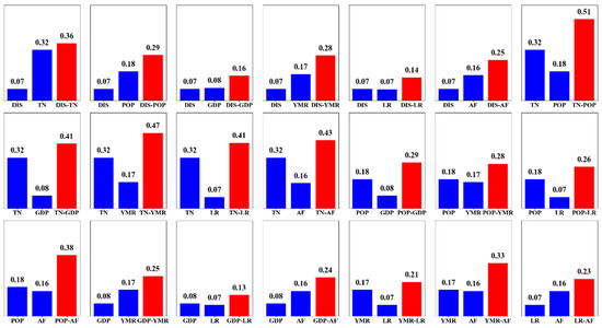 Interaction detection evaluates whether the combined effect of two factors affects the interpretation of overall sentiment. Figure 9 shows the results of the interaction detection. The results show that, except for the interactions among DIS-LR, GDP-YMR, GDP-AF, YMR-AF, and LR-AF, which are independent, the interactions among the other factors increase the determinant power on sentiment. The interaction of TN-POP has the strongest ability to explain sentiment, followed by TN-YMR, which are 0.51 and 0.47, respectively. Under the joint action of disaster factors and social factors, the spatial difference in sentiment will be more obvious. TN-AF, TN-GDP, TN-LR, AF-POP, and DIS-TN also have relatively high interpretive capabilities for sentiment. This shows that disaster factors significantly enhance their interpretive capabilities when interacting with other factors, while the interaction among society, economy, and culture is not as obvious.