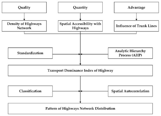 Transport dominance is an integrated index to evaluate the merits and demerits of regional transportation. Its core is to judge regional traffic conditions from the relative perspective of quantitative methods on the larger regional system [40]. Regional transport dominance combines three aspects, including point, line, and area. Point reflects the spatial influence of the transport node. Line represents the spatial influence of the transport line, which could be linked by two nodes or two districts. Area shows the regional transport development [25]. The more significant the transport dominance is, the greater the conditions and potential for its economic development. Based on the analysis of the relevant research results, this paper constructs the evaluation index system of transport dominance from three perspectives, which includes quality, quantity, and advantage to measure the development level of transport infrastructure network and reflect its supportive capacity for its socio-economic activities in the Qinghai–Tibet Plateau. The weight of each indicator is determined by AHP to evaluate the highway transport dominance in the Qinghai–Tibet Plateau comprehensively.