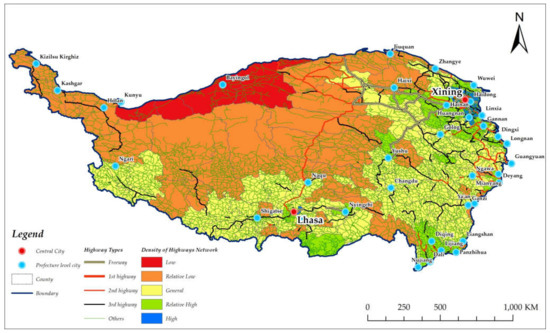 In Equation (1), n is the number of counties; Pij is the proportion of the j-th mode of transportation in county i, Lij is length of the j-th mode of transportation. According to the situation of the Qinghai–Tibet Plateau, the Pij values of freeway, 1st highway, 2nd highway, 3rd highway and others are given as 2.5, 2.0, 1.5, 1.0 and 0.5, respectively [41].