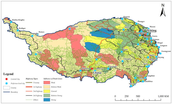 As is shown in Figure 5, the overall level of influence of trunk lines on the Qinghai–Tibet Plateau is relatively low. The degree of highway influence between counties is different, showing a trend of sparseness from east to west, from central cities to remote areas. Among them, strong impact areas are Golmud City in the middle and the urban agglomeration areas in the east with Xining as the center. Most of the surrounding areas of strong impact are areas with relatively strong impact. Areas with general impact are mainly connected to relative impact areas from the east, northeast, and southwest. Most of the areas with relative weak impact and weak impact areas are distributed in the western and southern areas.