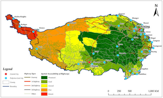 Based on the highway dataset (freeway, 1st highways, 2nd highway, 3rd highway, and passenger stations, etc.) in the Qinghai–Tibet Plateau, this paper calculates the shortest travel distance of 209 counties with the Origin–Destination (OD) matrix and calculates the spatial accessibility of highway traffic using Equations (3), (4) and (5). According to the same processing principles as described in Section 4.1, the spatial accessibility of highways in the Qinghai Tibet Plateau are divided into five levels, including prominent area, good area, general area, poor area, and remote area.