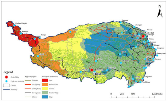 The transport dominance is divided in five levels by Natural Break, namely, high area, relative high area, general area, relative low area, and low area. The classification of Natural Break is based on the natural grouping in the data, and identifies the classification interval, which can be the most appropriate similarity, and maximizes the differences between classes [49]. As is shown in Table 3 below, there are 45 counties with a high grade of transport dominance in the Qinghai–Tibet Plateau, accounting for 21.53% of the total counties in the study area, and the land area is 583,639.50 km2, accounting for 22.48% of the total area of the study area. A total of 97 counties belong to the relative high area, accounting for 46.41% of the total counties, and the land area is 831,603.45 km2, accounting for 32.04% of the total area. There are 43 counties with general dominance, which is 20.57% of all counties, and it covers a land area of 720,643.25 km2, which is 27.76% of the total area. A total of 17 counties are the relative low area, accounting for 8.13% of the total counties, and the land area is 341,422.76 km2, accounting for 13.15% of the total area. Finally, there are 7 counties in the low area, accounting for 3.34% of the total counties, and the land area is 118,566.06 km2, accounting for 4.57% of the total area.