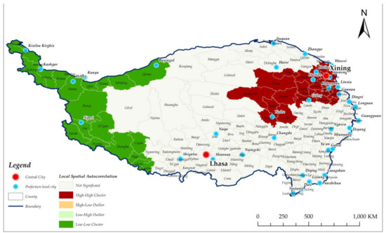 As shown in Figure 10, from the perspective of local spatial autocorrelation, the highway transport dominance in the Qinghai–Tibet Plateau presents a spatial agglomeration pattern and shows spatial heterogeneity. In the local Moran’s I spatial pattern, the High–High agglomeration area are mainly concentrated in 34 counties of Xining City and its surrounding counties, including Guinan, Gonghe, Xinghai, etc. The Low–Low agglomeration area are mainly concentrated in 22 counties, including Qiemo, Minfeng, Hotan, Karakax, etc.