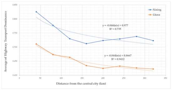 Relationship between the distance from the central city and highway transport dominance.