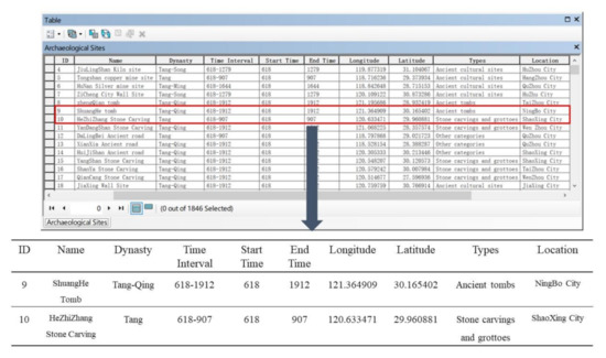 We collected the spatial longitude and latitude of these Archaeological Sites’ data and input all the attribute values into the analysis tool to get the database of the research object. In the Archaeological Sites database, each Archaeological Site is represented by the corresponding point data. Its attribute values include ID, name, dynasty, time interval, start time, end time, longitude, latitude, types and the corresponding geographic location, as shown in Figure 1.