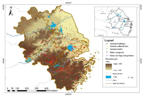 The study area of the Tang Dynasty to the Qing Dynasty, covering five dynasties in Archaeological Sites spatial distribution, is shown in Figure 2 and Figure 3.