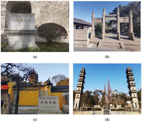 Examples of Archaeological Sites: (a) The Palace Museum of Ming Dynasty in Nanjing country, (b) The Canglang Pavilion in Suzhou country, (c) The Baoen Temple Pagoda in Suzhou country, (d) The Two pagodas of Guangjiao Temple in Xuancheng country.