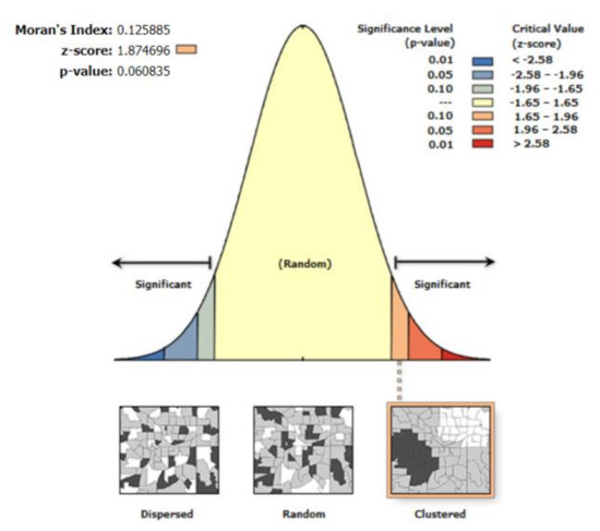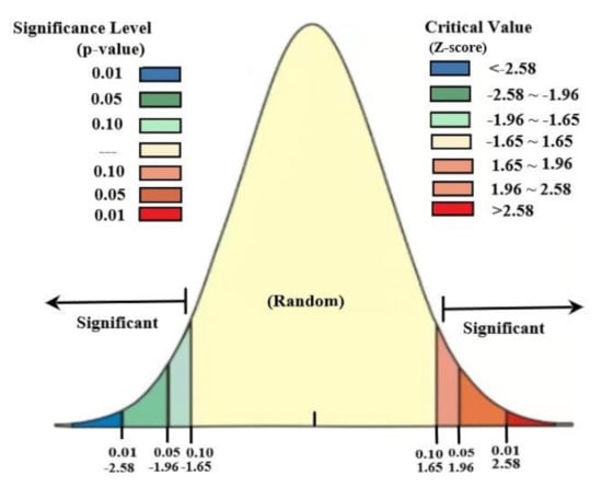 The prerequisite for using Getis-Ord Gi* to calculate the significant cold- and hot-spots of Archaeological Sites is that the Archaeological Sites’ datasets have spatial clustering characteristics. Based on the null hypothesis of the random distribution of Archaeological Sites, this paper first carries out element model analysis. Element model analysis is mainly used to judge the spatial correlation of Archaeological Sites. The Z-score and p-value calculated by this analysis tool can be used to determine whether the Archaeological Sites’ data shows statistically significant clustering characteristics or discrete patterns. In a normal distribution, Z-scores and p-values are used to measure the spatial distribution pattern. Z-score is a multiple of standard deviation, reflecting the dispersion degree of a dataset. The p-value represents the probability, and reflects the probability of an event [48]. As shown in Figure 4, if on both ends of the statistical results appear very high or very low Z-scores, corresponding to the smaller p-values, the Archaeological Sites are detected with a point spatial distribution pattern of a dataset that does not conform to the null hypothesis represented by a random pattern, whereas if the absolute value of Z-score is higher, corresponding to the larger p-values, it represents that the Archaeological Sites of point data have obvious characteristics of spatial clustering.