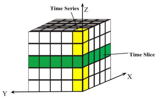 We use the space-time cube to express the space-time dimension. The space-time cube model was proposed by Hagerstrand, who introduced the time axis into the traditional two-dimensional space and expressed spatio-temporal data by constructing the space-time cube [52]. Each space-time cube is made up of a single space-time bar, consisting of rows, columns and time steps. In the space-time cube, the number of rows multiplied by the number of columns multiplied by the number of time steps is the total number of columns in the space-time cube. The rows and columns of the space-time cube describe the spatial position of geographical objects, and the time step of the space-time cube represents the time attribute of the geographical object. The space-time cube is constructed to intuitively show the spatial characteristics and attribute characteristics of geographical entities (or phenomena) changing with time in the three-dimensional space, as shown in Figure 5.