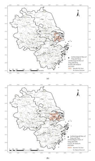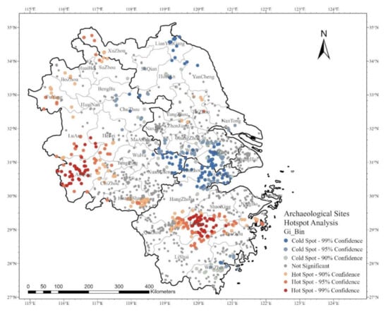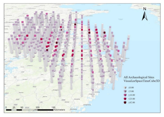 If the data of Archaeological Sites show spatial clustering characteristics through element pattern analysis, then Getis-Ord Gi* is used to calculate the significant cold- and hot-spots of Archaeological Sites. However, using the Getis-Ord Gi* method can only calculate the cold- and hot-spots of Archaeological Sites in space, which shows the distribution of high-value clustering or low-value clustering of Archaeological Sites in space. The time attribute of Archaeological Sites is not fully utilized.