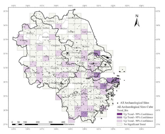 As can be seen from the figure, the purple region is the time series of the Archaeological Sites’ data bars with an upward trend. Among 189 data cube locations of Archaeological Sites, 47 data cube locations of Archaeological Sites showed an upward trend. On the whole, these upward trending space-time cube bars are mainly distributed in the marginal areas and some central areas, and it shows that the distribution of Archaeological Sites in these areas is increasing in time and space. Among them, belonging to Anhui Province, there were 17 spatio-temporal columns, accounting for 29.79%. Belonging to Jiangsu Province, there were 9 spatio-temporal columns, accounting for 19.14%, and belonging to Zhejiang province, there were 21 spatio-temporal columns, accounting for 44.68%.