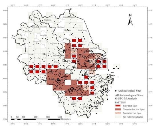 In this paper, a research method of spatio-temporal variation law based on the G-STC-M method for spatio-temporal analysis of Archaeological Sites was proposed. In the analysis of spatio-temporal data variables, the factor pattern analysis of the Archaeological Sites’ point data was firstly carried out to determine the spatial distribution of the Archaeological Sites’ point data as a clustering pattern. Getis-Ord Gi* was used to calculate the significant cold- and hot-spots of Archaeological Sites. According to Getis-Ord Gi* statistics, the returned Z-score and Gi* statistics (Gi_Bin) were obtained, and it was concluded that the northern and western parts of Anhui province and the central part of Zhejiang province in the study area were the hotspots of Archaeological Sites’ distribution. The corresponding cold spots are mainly distributed in the north and south of Jiangsu province, the southeast of Anhui province and the north of Zhejiang province.