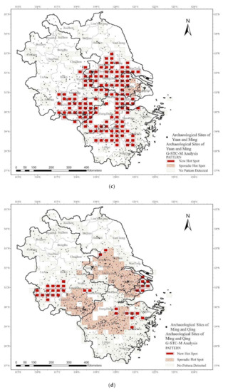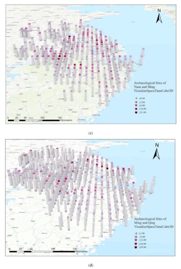 Analysis of space-time cube slices in Archaeological Sites. (a) G-STC-M analysis of Archaeological Sites of Tang and Song Dynasties, (b) G-STC-M analysis of Archaeological Sites of Song and Yuan Dynasties, (c) G-STC-M analysis of Archaeological Sites of Yuan and Ming Dynasties, (d) G-STC-M analysis of Archaeological Sites of Ming and Qing Dynasties.