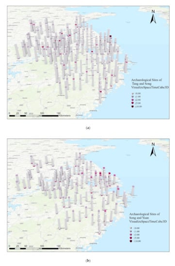 The symbolized cube directly expresses the spatio-temporal trend changes of the Archaeological Sites’ data. The darker the color of the column is, the more Archaeological Sites that appeared in that period. A single gray cube indicates that the number of Archaeological Sites is 1 or less than 1. According to the cube diagram, the spatio-temporal distribution of the Archaeological Sites and the changing trend of each time stage can be analyzed, showing the changes of Archaeological Sites from the Tang Dynasty to the Song Dynasty, as shown in Figure 9.