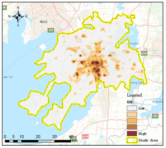 Figure 1 shows the kernel density estimation of all property crimes (over 130,000 cases) in the study area from January 2012 to October 2013. The crime data were acquired from the local police department, and the dataset contains the case number, crime type, occurring time, geographical coordinates, etc. In this paper, our target crime types were burglary, theft, and robbery, which are classified by the police as common types of property crime in Suzhou [3,49,50].