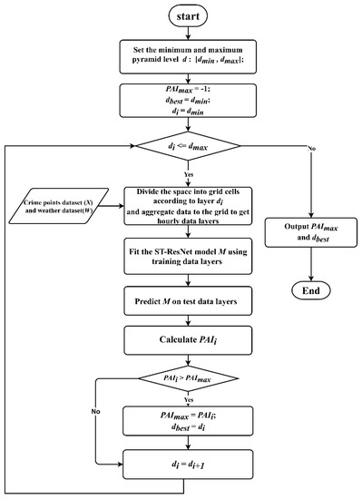 To improve the effectiveness of hourly crime prediction, we proposed an adaptive spatial resolution method to select the optimal unit for crime prediction models. The ST-ResNet model was used to predict the crime risk. The PAI was used to measure the accuracy of the results at different spatial resolutions [29]. Figure 2 indicates the procedure of the method.