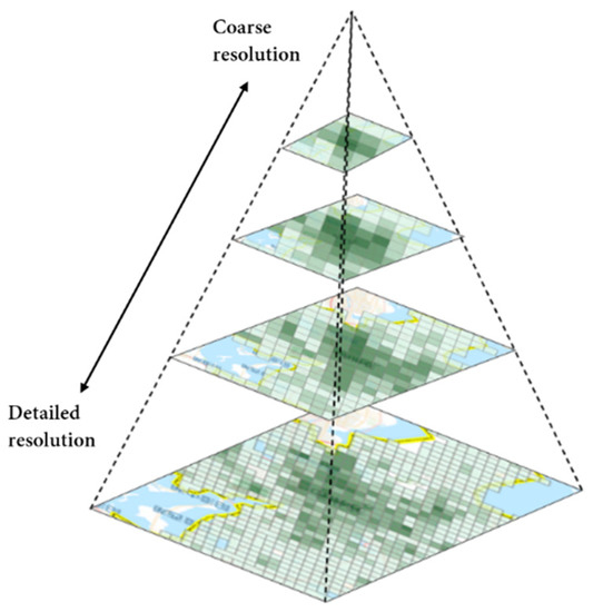 A data pyramid [56] was produced to aggregated points to the grid at multiple scales, as shown in Figure 3. Most web mapping services like Google Maps and Microsoft Bing Maps adopt the pyramid technique to provide on-demand map content to users [57,58]. The discretization method we used is the same as in these web mapping services. The procedure starts with a coarse resolution and then recursively generates the other resolutions. The points are aggregated to the layers in each calculation of the ST-ResNet model. The base resolution is set to 9.6 km, which corresponds to the 12th level of the pyramid according to the local maximum patrol area.