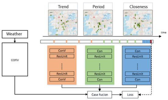 The ST-ResNet model predicts crime risk based on weather records as well as crime patterns including trend, period, and closeness (Figure 4). The trend indicates the tendency of the number of crimes to increase or decrease. The period refers to the periodic pattern of crime at a certain time scale. Compared with distant ones, crimes committed closer together in time are more likely to be related. Therefore, “closeness” refers to the time distance between crime pairs. Following the research of Wang (2019), the experiment adopted hourly, daily, and weekly levels as the time spacings of the 3 crime periodic characteristics [29].