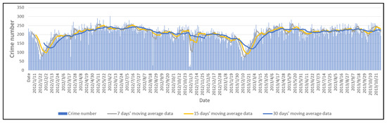 Figure 5 shows the daily statistics, 7-day moving average data, 14-day moving average data, and 30-day moving average data for property crime events from January 2012 to October 2013.