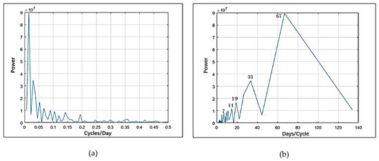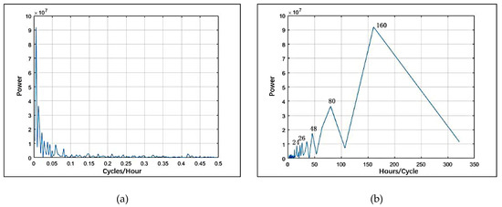 The power spectrum method [62] is used to calculate the periods of crime data. The magnitude squared of Fourier coefficients is a measure of power. The power is computed on one-half of the coefficients since half of them are repeated in magnitude. We plotted the power spectra as a function of frequency, measured in cycles per hour and per day. To interpret the view of the cyclical activity more easily, we also plotted power as a function of period, measured in hours and days per cycle. Figure 6 shows the power spectrum (a) and the period of the hourly data (b). The average periods passing the significance test are 24 h, 48 h, 80 h, and 160 h. The repeating short-term cycle can be seen in daily periodicity. Figure 7 shows the power spectrum (a) and the period of the daily data (b). The average periods passing the significance test are 7 days, 14 days, 19 days, 33 days, and 67 days. This shows the weekly trend of the crime data.