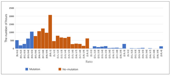 We calculated the ratio of the number of cases in adjacent hours, excluding some moments with abnormally high or no cases; then, we counted the number of hours corresponding to each ratio value from January 2012 to October 2013. Figure 8 shows the ratio statistics. Ninety-five percent of adjacent hours have a ratio of cases between 0 and 4. Considering that the number of cases per hour is small, we defined the times when the ratio value was between 0.5 and 2 (which means the change rate is no more than 100%) as no-mutation hours and the times when the ratio value was less than 0.5 or greater than 2 as mutation hours. We also calculated the ratio of the number of cases between periods of two-hour intervals and three-hour intervals. Table 2 shows the percentages of no-mutation hours in the three situations. Although the percentage of no-mutation hours decreased as the time interval increased, it was still high for all three intervals. Therefore, it can be concluded that there are interactions between the cases at adjacent moments (1–3 h).
