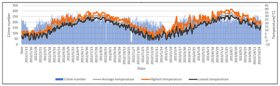Weather can influence crime rates and criminal behavior, and each variable has a diverse effect on different crime types [51,52,53]. In short-term crime prediction, weather variables are common predictors, and temperature is a significant one for property crime prediction [29,54]. In this study, we chose temperature as the external influence of the model. Data on daily average temperature, highest temperature, and lowest temperature data for the 671 days from January 2012 to October 2013 were collected from the China Ministry of Agriculture Planning and Design Institute [55].
