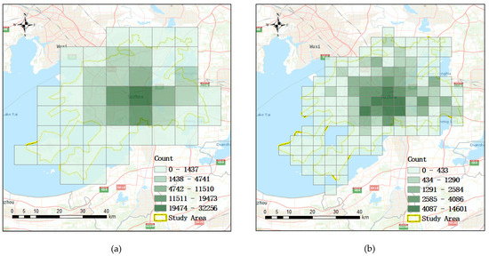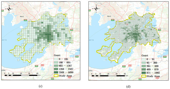 Property crime distribution at different spatial resolutions from January 2012 to October 2013: (a) crime distribution at a 9.6 km spatial resolution; (b) crime distribution at a 4.8 km spatial resolution; (c) crime distribution at a 2.4 km spatial resolution; (d) crime distribution at a 1.2 km spatial resolution.