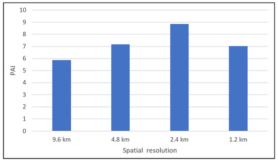 We ran models with optimal hyperparameters at different spatial resolutions (from 1.2 km to 9.6 km) and calculated the PAI of the prediction results (shown in Figure 11). The highest PAI was achieved with a 2.4 km spatial resolution in our study area with RMSE = 7.81.