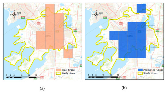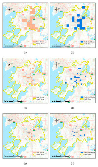 Figure 12 shows the prediction results and the actual distributions at the different four resolutions at 12 a.m. on 1 January 2013. Binary maps were adapted because the crime prediction evaluation index PAI deals with a place being a crime hotspot or not (binary). Colored grids represent the occurrence of crimes. In general, true prediction results are concentrated in city centers, which are areas with high crime densities; in edge areas, predictions are poor. Although the similarity between the prediction results and the actual distributions decreases with increasing resolution, there is a trade-off between the grid size and practical police force arrangement. PAI values of prediction results at a 1.2 km resolution (Figure 12b), 2.4 km resolution (Figure 12d), 4.8 km resolution (Figure 12f), and 9.6 km resolution (Figure 12h) resolution are 2.7, 5.9, 9.8, and 3.3, respectively. Larger grid cells can capture more criminal activities but lead to difficulties for police arrangements. Finding crime hotspots with an appropriate grid cell size is crucial to arranging police forces effectively.