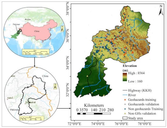 The study area is located at 31°0′ N–38°0′ N longitude and 70°0′ E–80°0′ E latitude, covering the upper Indus basin (Pakistan) and southwestern part of the Tashkurgan Valley (China) (Figure 1). The transboundary study area was selected based on the importance of the CPEC project. The main route of the CPEC project (KKH) passes through the northern areas of Pakistan and connects to China through the Khunjerab Pass. The mainstream channel in this area is the Indus River, which flows along the KKH, from north to south. The river originates from the Tibetan Plateau (China), entering Pakistan in the Dardistan region through Jammu Kashmir (Indian Territory), crossing the Himalayas, and finally flows into the Arabian Sea. This region is highly prone to geohazards, including debris flow and landslides, because of its uneven terrain, high seismicity, and high intensity of monsoon precipitation (200–500 mm), spanning from July to mid-September (http://www.pmd.gov.pk/en/ (accessed on 2 February 2021)).