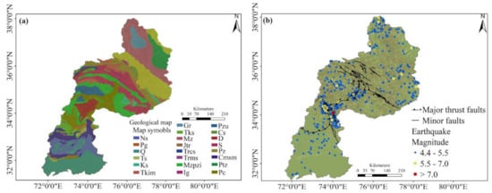(a) Geological map of the study area (http://gsp.gov.pk and http://en.cgs.gov.cn/ (accessed on 2 February 2021)) and (b) tectonic map with epicenter of earthquakes from last 10 decades (http://gsp.gov.pk and http://en.cgs.gov.cn/ (accessed on 2 February 2021)). Ns = Neogene sedimentary rocks, Pg= Paleogene metamorphic and igneous rocks, Q = Quaternary sedimentary rocks, Ts = Tertiary meta-sedimentary rocks, Ks = Miocene to cretaceous batholith and plutons, Tkim = Miocene to cretaceous igneous and metamorphic rocks, Gr = Undifferentiated tertiary rocks, Tks = Miocene to cretaceous metamorphic rocks, Mz = Jurassic and cretaceous sedimentary rocks, Jtr = Jurassic and Triassic igneous rocks, Trcs = Lower Triassic to upper carboniferous igneous rocks, Trms = Mesozoic to Paleozoic meta-sedimentary rocks, Mzpzi = Mesozoic and Paleozoic intrusive igneous and metamorphic rocks, Ig = Permian to carboniferous igneous and metamorphic rocks, Pzu = Upper Paleozoic igneous rocks, Cs = Carboniferous meta-sedimentary and sedimentary rocks, D = Devonian igneous rocks, S = Undivided Silurian rocks, Pz = Paleozoic metamorphic rocks, Cmsm = Cambrian Sedimentary and metamorphic rocks, Ptz = Archean to Proterozoic metamorphic rocks, Pc = Undivided Precambrian.
