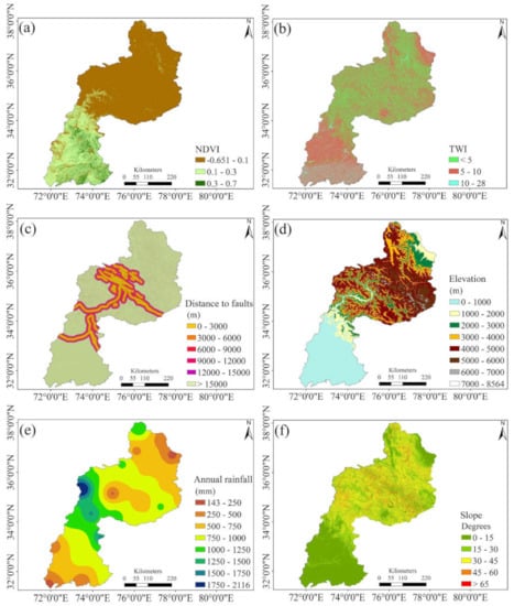 The first step for the development of GHSMs is the determination of causative factors. Based on previous studies and the characteristics of geohazards in the study area [29,34,38], NDVI, TWI, distance to faults, elevation, annual mean rainfall, slope (degree), slope aspect, profile curvature, distance to rivers, distance to road, LC, geology, and SPI were selected as conditioning factors (Figure 3). The elevation of the study area was extracted from a Shuttle Radar Topography Mission (SRTM) 30 m digital elevation model (https://earthexplorer.usgs.gov/ (accessed on 2 February 2021)), and the slope, slope aspect, profile curvature, SPI, TWI, and drainage network layers were developed from the elevation map in the ArcGIS platform. The annual mean rainfall map was prepared based on 27 weather stations (from 2000 to 2015) in the study area, using the Inverse Distance Weighted (IDW) tool in ArcGIS [51,52]. Geology and faults of the study area were collected from a regional geological map of the study area (at the scale of 1:1,000,000) (http://gsp.gov.pk and http://en.cgs.gov.cn/ (accessed on 2 February 2021)). A brief description of these conditioning parameters is listed in Table 2.