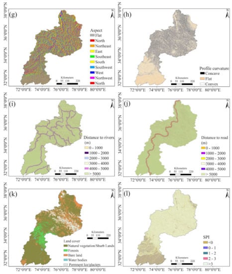Conditioning factors used for geohazards susceptibility maps: (a) NDVI, (b) TWI, (c) Distance to faults, (d) Elevation, (e) Annual mean rainfall, (f) Slope, (g) Slope aspect, (h) Profile curvature, (i) Distance to rivers, (j) Distance to road, (k) Land cover, and (l) SPI.