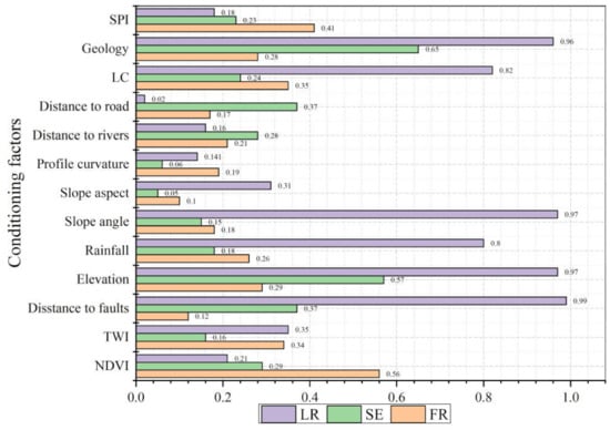 Factors controlling spatial distribution of geohazards obtained via LR, SE, and FR models.
