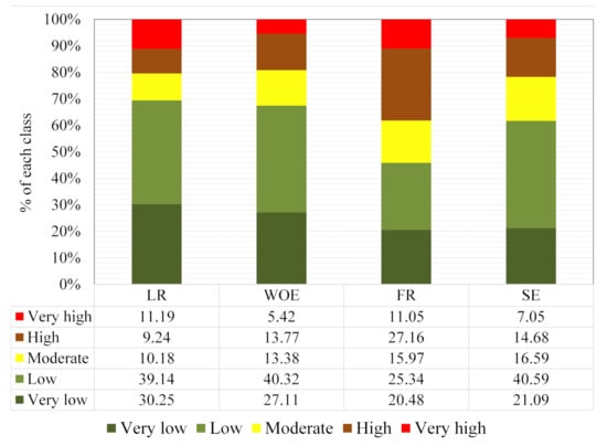 Ultimately, the GHSI for LR was calculated, using Equation (16). The probability value varies from 0 to 1 [25]. The final SI values were reclassified into five classes: very-low, low, moderate, high, and very-high (Figure 5), using the natural breaks method [83]. In this model the percentage of very-high, high, moderate, low and very low susceptibility areas are 11.19%, 9.24%, 10.18%, 39.14%, and 30.25%, respectively, as shown in Figure 6.